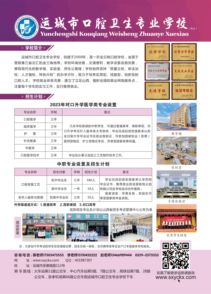 运城市口腔卫生专业学校创建于2000年,是经运城市教育局批准的一所全日制职业高中学校。学校坐落于秦、晋、豫三省交汇的金三角带,交通条件便利,校园环境优雅,师资力量雄厚,教学设施*,拥有配备现代教学设备的教学楼、实验楼、师生公寓楼,开设有口腔修复工艺、老年人服务与管理等热门专业,对口升学有口腔医学、临床医学、中医学、护理等专业,拥有口腔临床、口腔修复、生理解剖、护理等多个专业实验室,下有圣林康复中医院、牙一生口腔门诊部、山西文妍义齿有限公司三个单位,并同全国各地20多家口腔医院(门诊)等签订实习就业合作协议,良好的教育教学资源为学生学习、就业、深造搭建平台,吸引着来自全国各地二十多个省市、自治区的莘莘学子。建校二十五年来,学校不仅为社会培养了万余名口腔专业人才,还先后被山西省教育厅、山西省民政厅、运城市人民政府、运城市教育局、运城市民办教育发展协会等授予“*办学单位”、“*社会办学单位”、“行业十大品牌单位”、“品牌学校”、“特色学校”等荣誉称号,受到了学生家长及社会各界人士的高度认可。